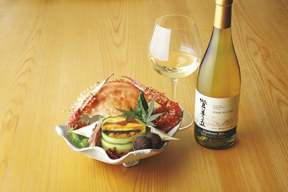 合わせるワインは「登美の丘 シャルドネ 2013」。シャルドネと甲殻類は伝統的な組み合わせで世界的な定番ですが、その法則は和食と日本ワインでも鉄板です。「とりわけこのヴィンテージにはトースト香のような香ばしさがあり、蟹の香ばしさとも同調して、豊かなハーモニーを奏でますね」。