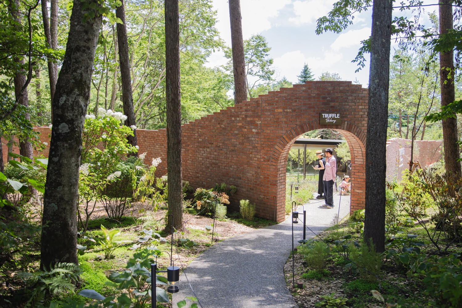 県道に面した小道から柔らかく曲がって伸びるアプローチを抜けると、赤いレンガ造りの門が別世界への入口のように現れる。両脇には山の景色と同じアカマツやカラマツなど細く長い高木の針葉樹と、足元には手入れされたシダ類、キボウシやアジサイ。さらに進むと、花々に囲まれたガラス張りのカフェ棟が出迎える。