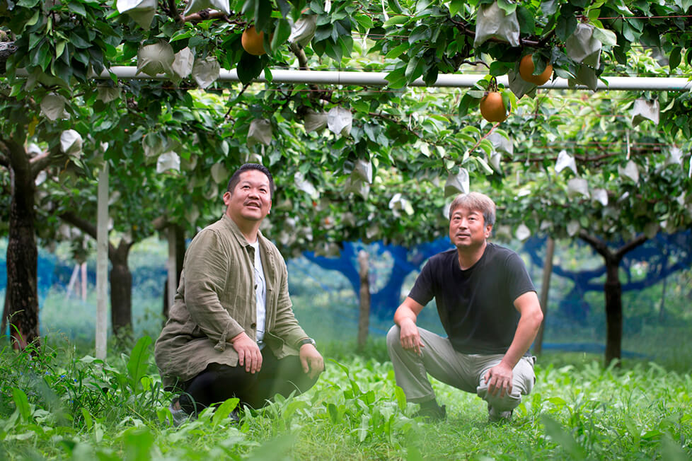 「特にこの地域は名水百選に選ばれた清水湧水の上にあり、良質な水がふんだんに湧きます。渇水の年でも水が枯れたことはありません。だから1年を通しておいしい果物が実るんですよ」。たっぷりの果汁をたたえた梨。そのおいしさの秘密は水にあった。さらに、冬にも梨があると聞いて、福山シェフはびっくり。