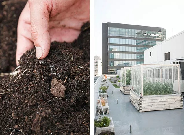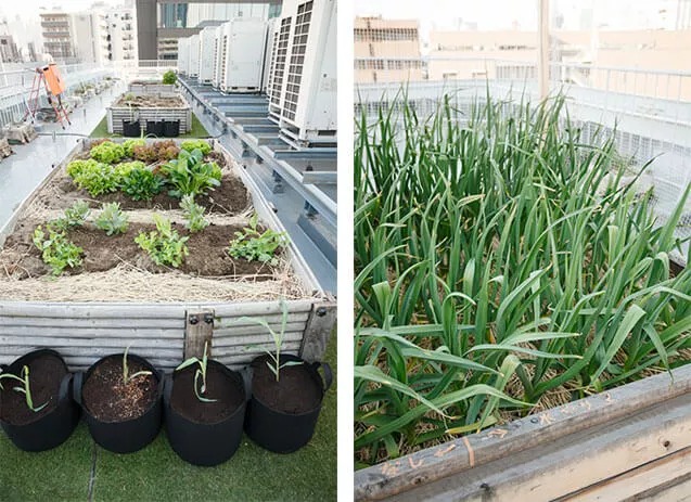 (右)恵比寿にある東急不動産所有のビルは、「新しい働き方の提案」がコンセプト。土に触れることでストレス値が下がる効果をテナントの社員にも実感してもらいたいと考えている。