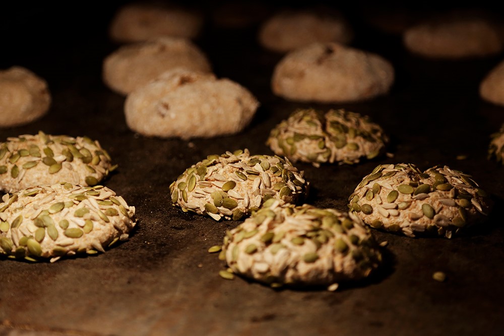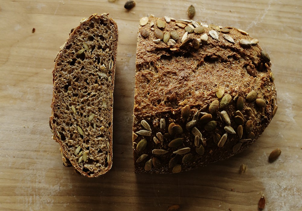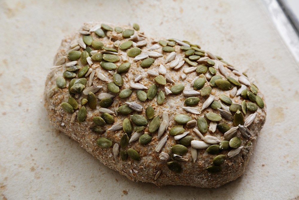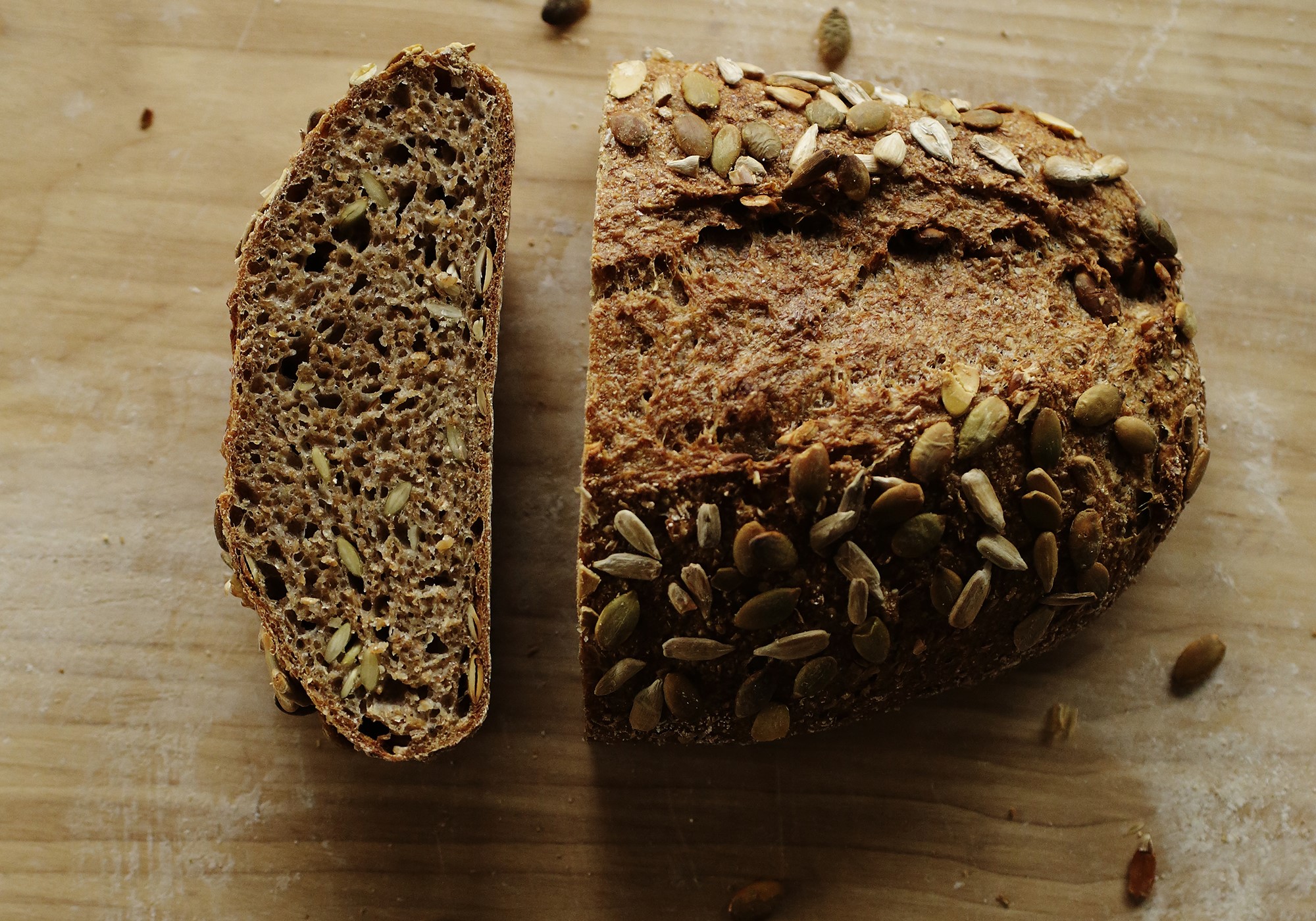 自家製粉の全粒粉のたねパン。生地にヒマワリとカボチャの種をふんだんに練り込んだ全粒粉のパン。焼いた当日はもちろん、翌日は味が馴染み、種の甘味がいっそう引き立つ。みずみずしい内相で、噛むほどに滲み出す旨味と、立ち昇る得もいわれぬ香りが後を引く。