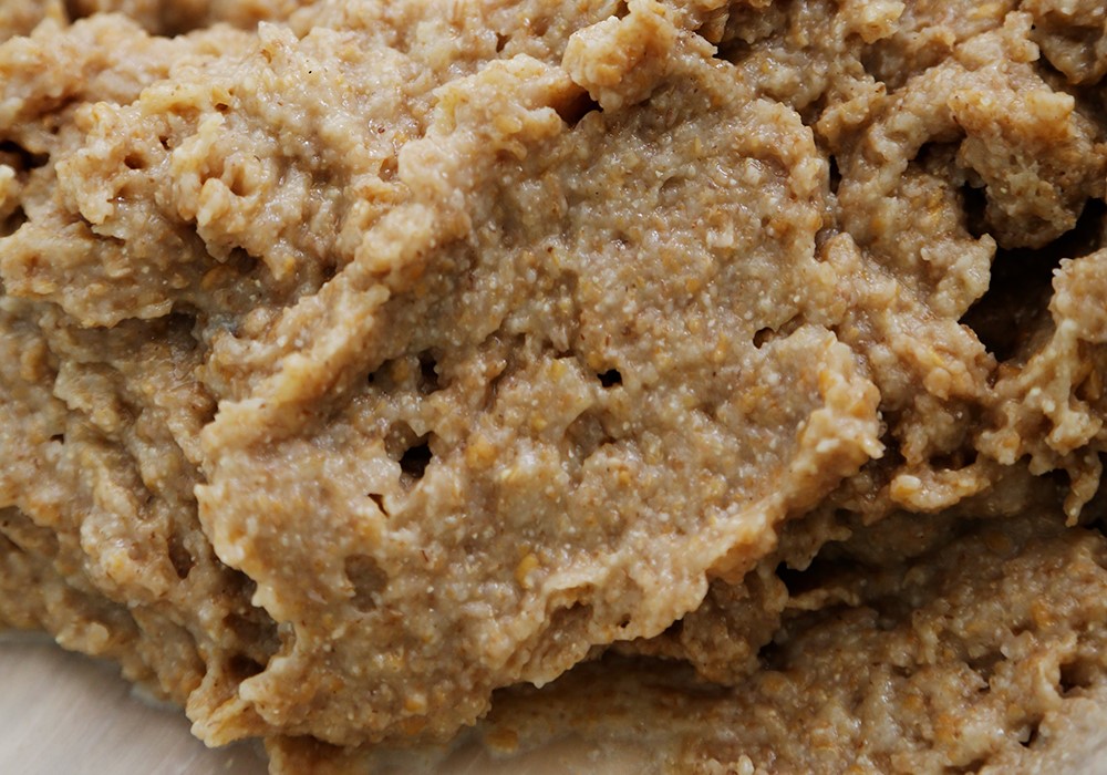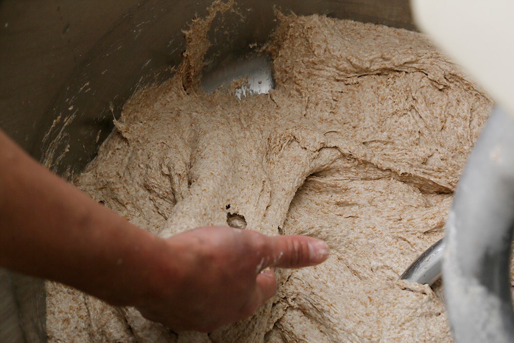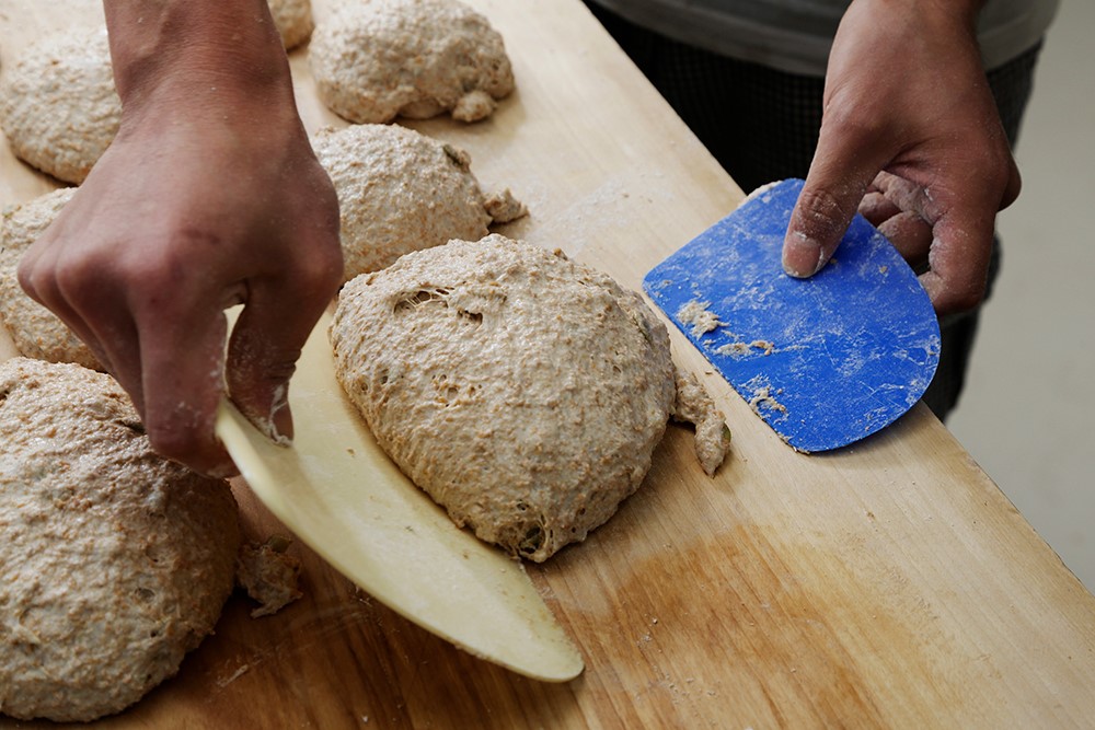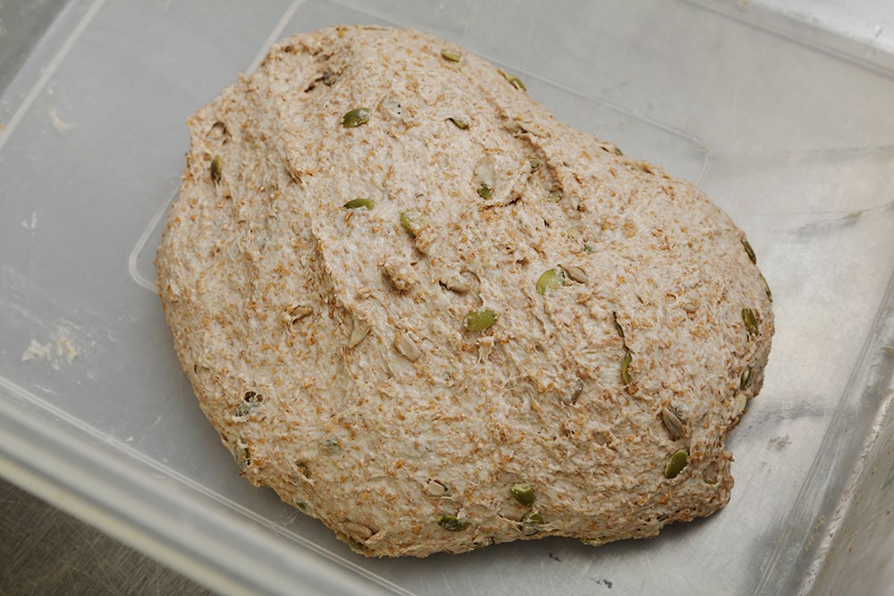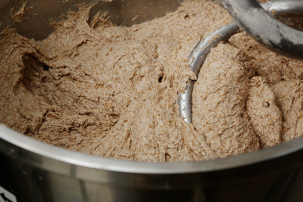 つながりにくい全粒粉は、湯種で保水性を上げると、ぼそぼそせずしっとりした食感に。ルヴァン種を混ぜて発酵させておくことで、さらに味が深まり、熟成、水和も十分進む。湯種に使う粉は残ったパンのパン粉で代用することも(40%以下の配合)。