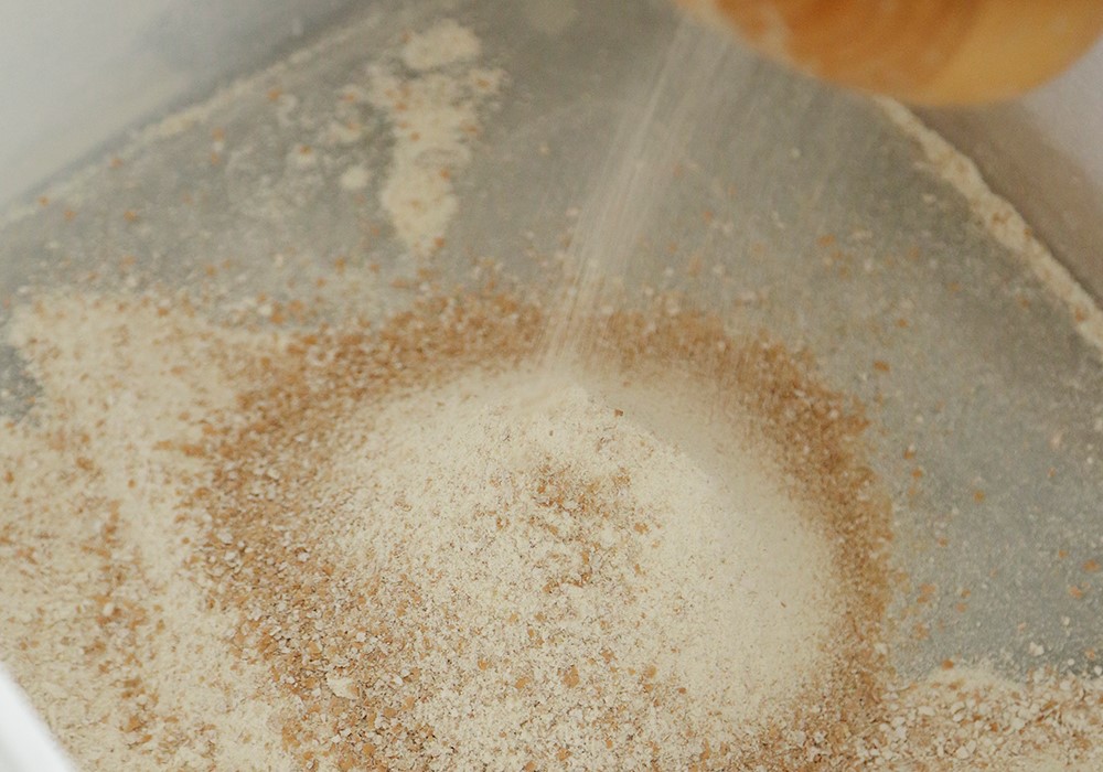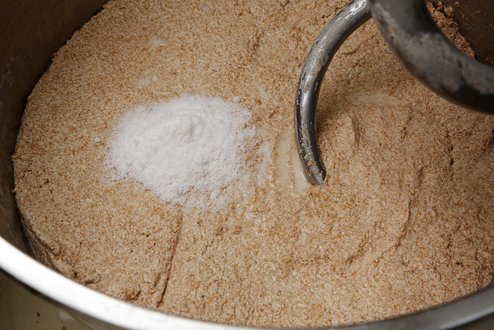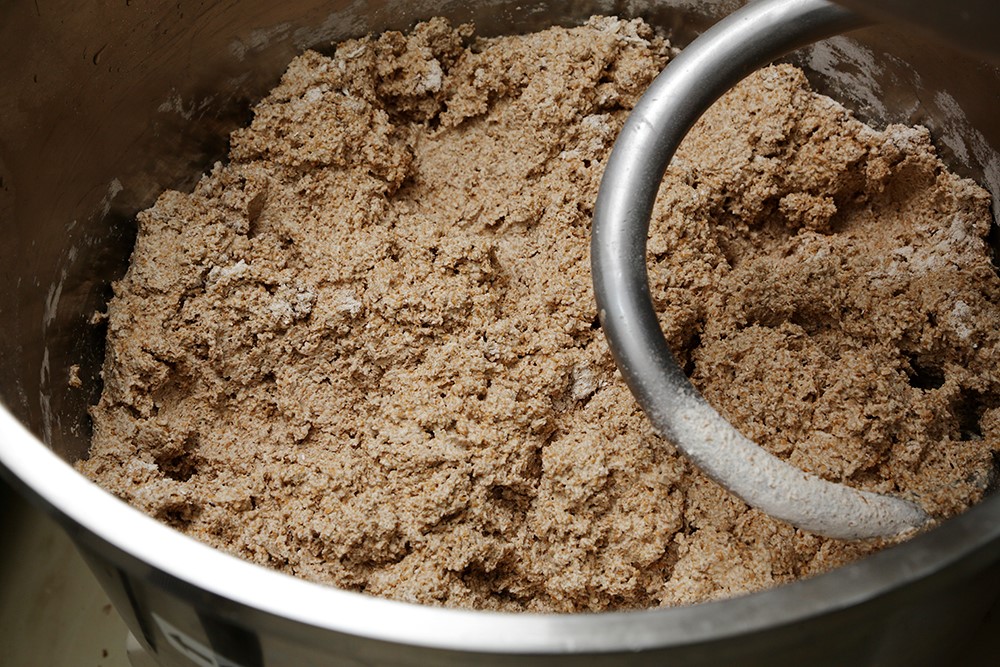 スパイラルミキサーに36℃の水(夏は氷水)と粉を入れ、全体が混ざるまで右回し左回しを切り替えながら、粉気がなくなるまで低速で2分回す。