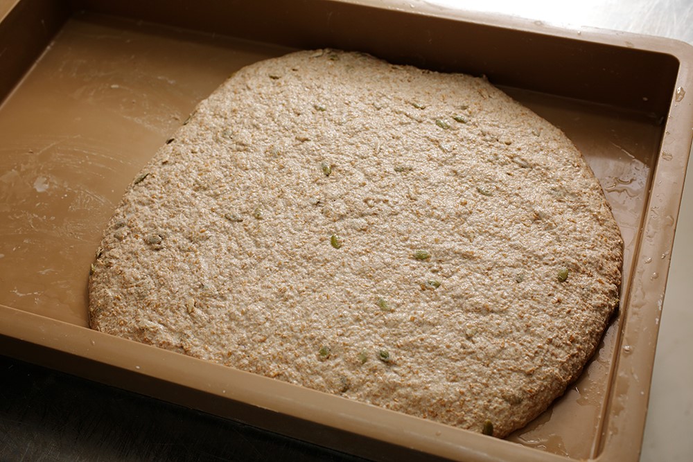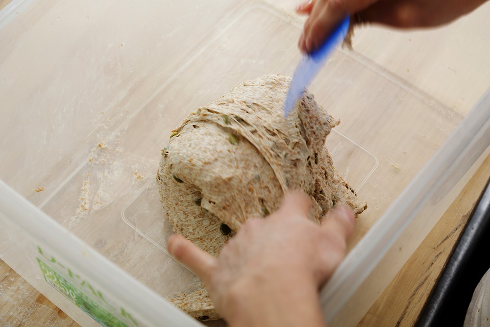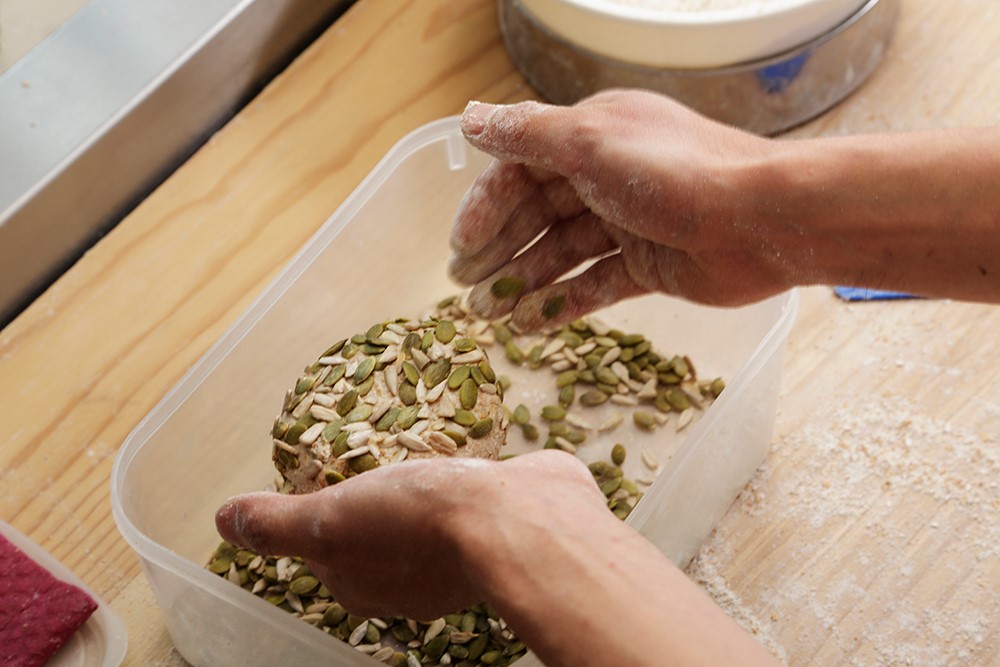 生地を容器に取り出し、カボチャとヒマワリの種をまぶし、折りたたみながら種を生地全体に行き渡らせる。