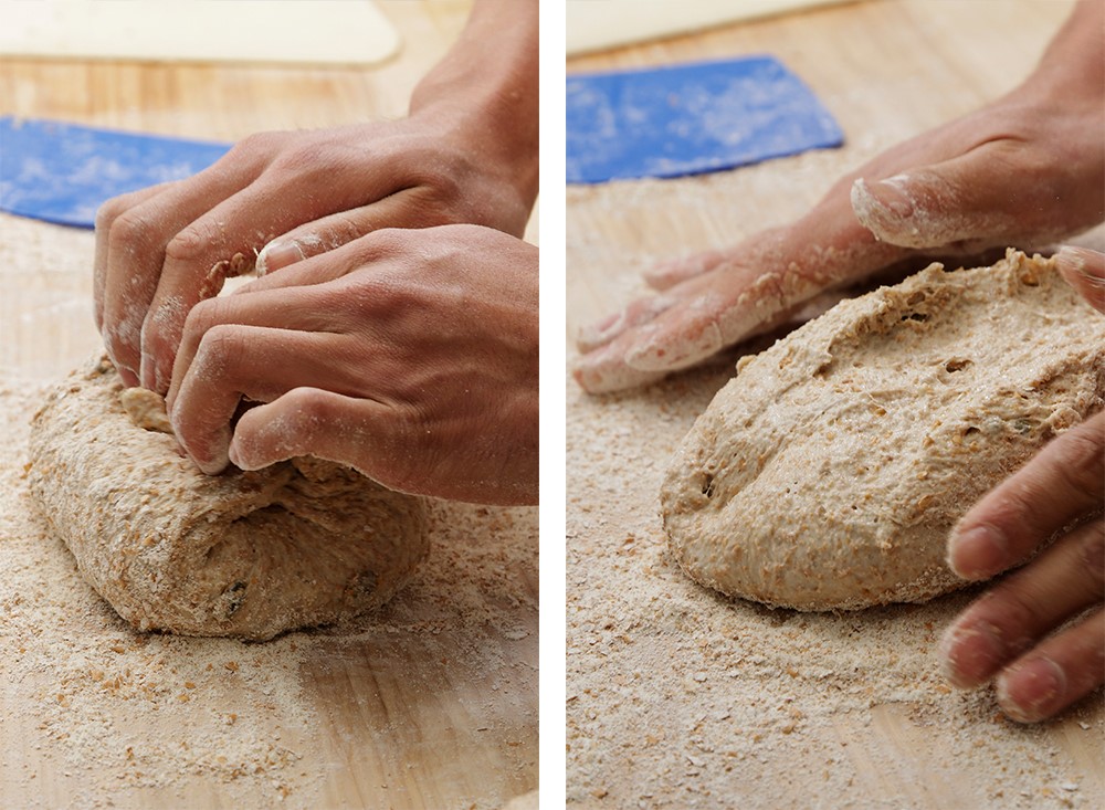 台に打ち粉(全粒粉)を振り、生地を両手で挟んで中央をすぼめて縦長に置き、手前から中央、奥から中央へ三つ折にする。閉じ目を指でつまんで押さえ、手前から奥へ二つ折にして閉じ目を押さえる。