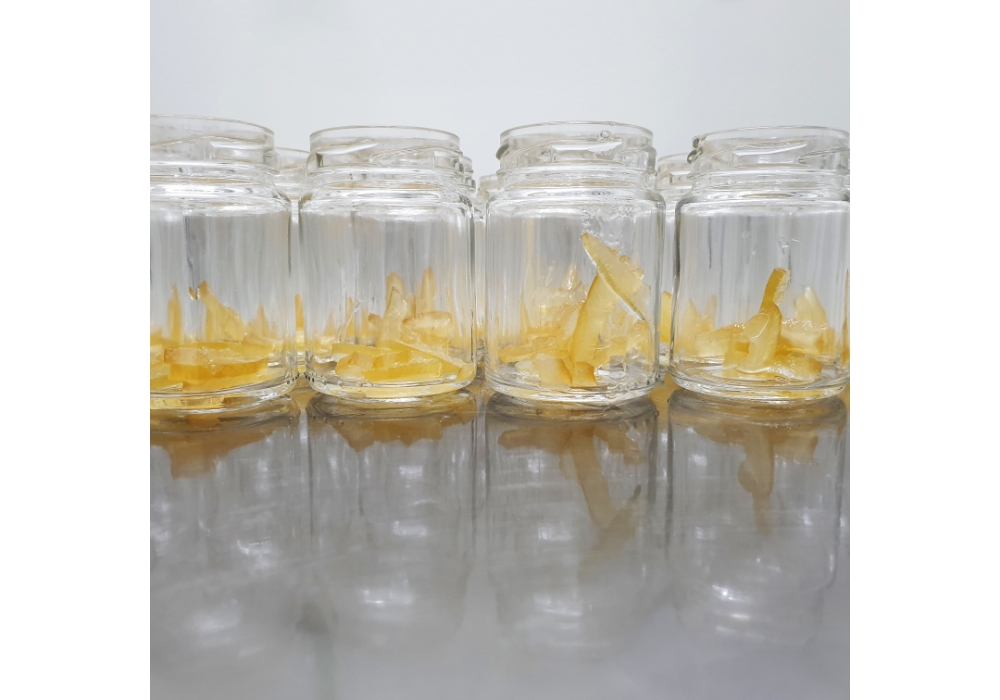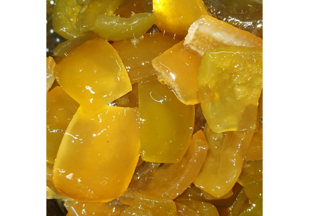 ベルガモットの外皮をすべて手作業で剥き、白い中果皮を取り、種をとった果肉を3日間冷水につけておく。水をきったら低温で8時間煮込み、前年の外皮を砂糖漬けにしておいたものを入れた瓶に流し込む。年間の生産量は 5000 個と少量生産だから、まさにお宝。ベルガモットのドライスライスにダークチョコレートをコーティングしたものや、友人からの依頼でカラブリア特産のナスの砂糖漬けなども作っている。