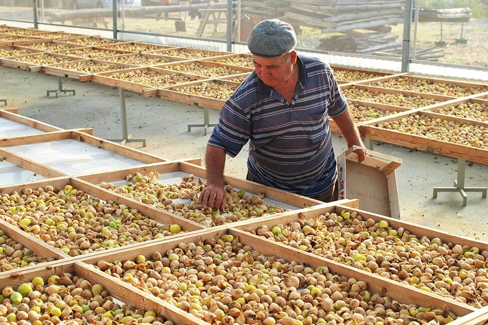 実は木に生っている状態で萎びさせてから収穫。水平に敷かれた石の上に広げ、藁や干し草で平らに覆う、あるいは葦で編んだ網の上で陽に晒した。