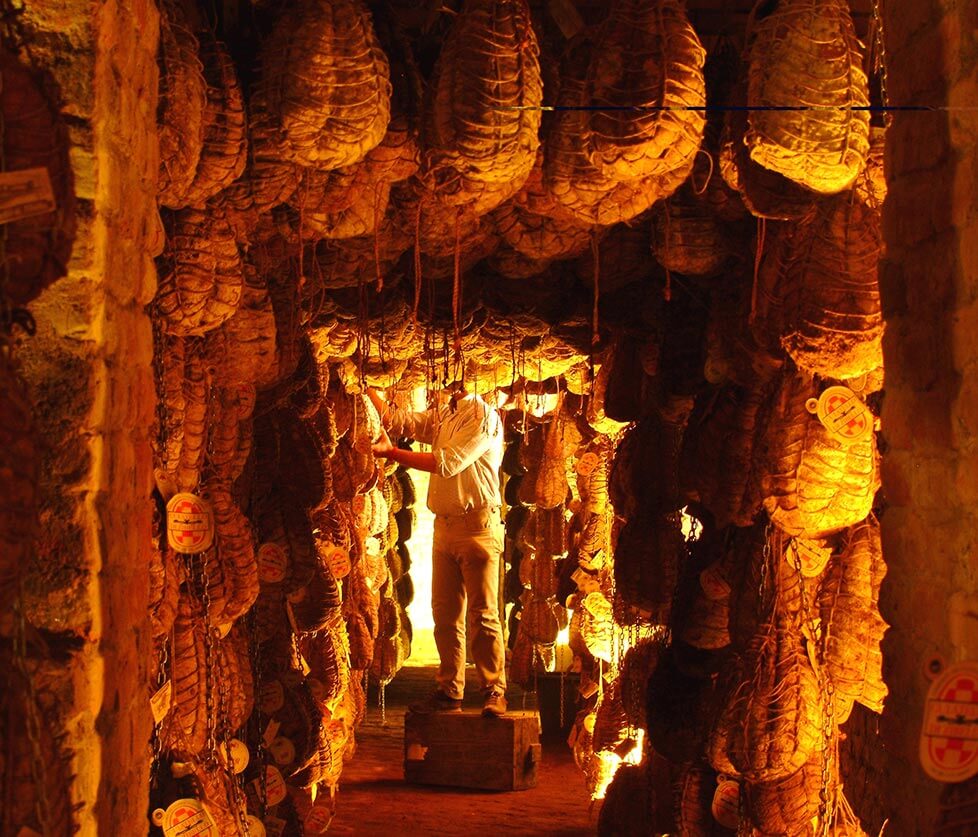 クラテッロは他の生ハムとは違い、よりデリケートで、熟成にはこの湿気が絶対に必要だ。