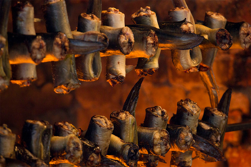 「ウナギは泥抜きをしたあと輪切りにし、交互に十文字にして串に差していきます。そして間口が2メートルある暖炉の前に置いて、炎を背にした状態で焼き始めます。高い位置から少しずつ火に向かって下ろしていくことで、暖め、加熱、炙りという主要な三段階の工程を踏んで焼かれていきます。火から下ろして熱を冷まし、一晩休ませた翌日に水、塩、酢で作った塩水にローレルの葉も加えて一緒に缶に詰められます。