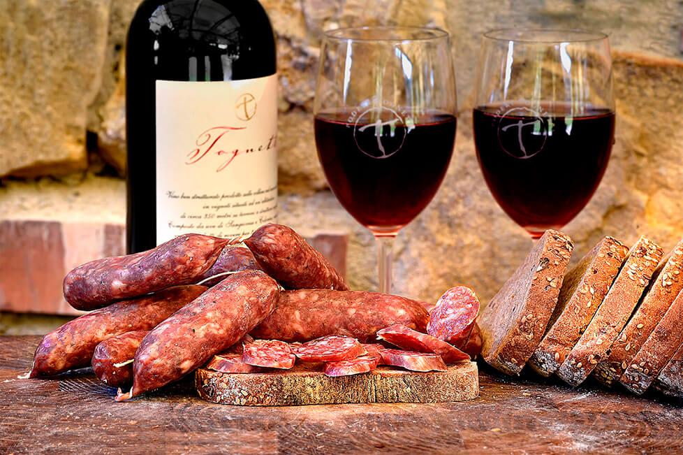 トスカーナの代表的なサラミといえばもちろん「ズブリチョローナ(sbriciolona)」。前述のジャンニ・ブレラが冗談交じりに使った表現を用いるなら『肉がそれはそれは柔らかく、味わいはやひゃひく(優しく)……』。さらにはイノシシ肉の加工品でもワイン風味、チェタルド産タマネギ風味、サラミにはトリュフ入りやサン・ミニヤート産サフランのサラミまで、バラエティの豊富さで彼らの右に出るものはいない。