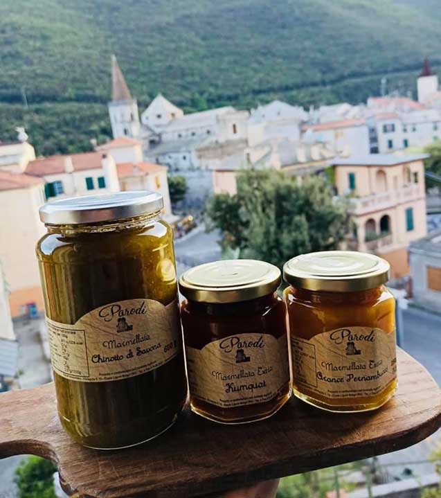 Siamo nell’entroterra di Finale Ligure, provincia di Savona, nell’Azienda Agricola di Parodi Alessandro fondata nel 1930 da nonno Lorenzo, già allora specializzata nella coltivazione e trasformazione di frutta, soprattutto agrumi, che nonno Lorenzo passava a vendere per i paesi con un carrettino, oggi restaurato a far bella mostra nel negozietto aziendale. Il Chinotto di Savona, Citrus Aurantium, varietà presente solo in Liguria, lo coltivano ormai da 2 generazioni.