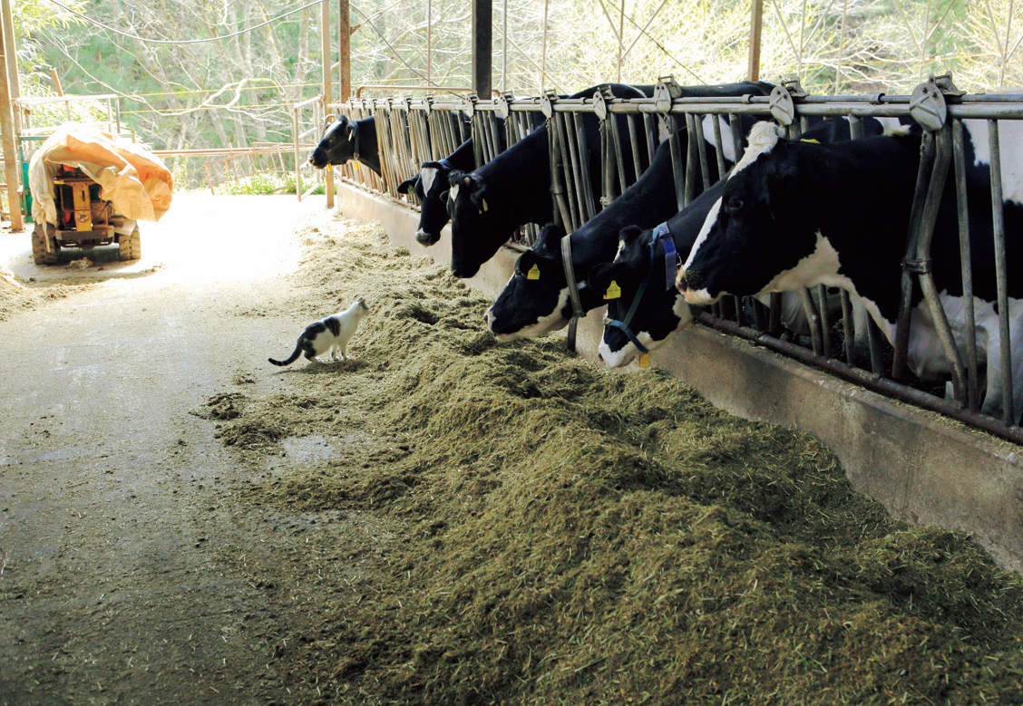 まず出会ったのは、学校給食用の牛乳を出荷する吉田牧場三代目・吉田恭寛さん。牛が自由に歩き回れる牛舎や、24時間食事をとれる環境など、ストレスのない牛の飼育を身上とし、エコフィードにも積極的に取り組む酪農家だ。