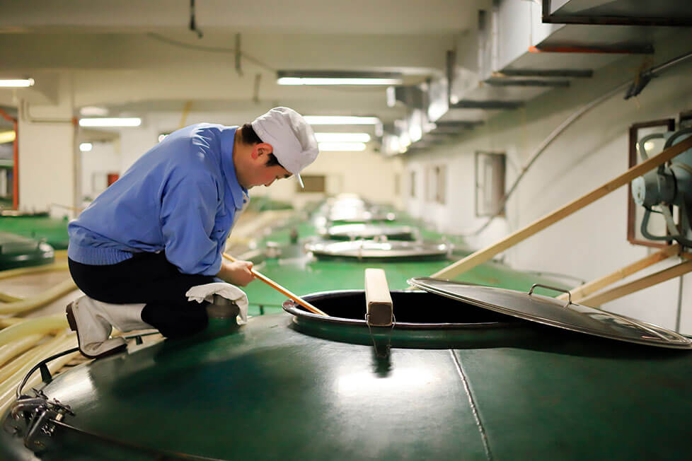 これは「鳩正宗」「八甲田おろし」で知られる十和田市「鳩正宗」の社是です。創業明治32(1899)年。当時は蔵のそばを流れる稲生川にちなんで「稲生正宗」の名で親しまれていましたが、昭和初期、蔵の神棚に住みついた一羽の白鳩を蔵の守り神として大切にし、以降「鳩正宗」に改名した歴史があります。平成16(2004)年、地元十和田市出身の佐藤企(たくみ)さんが杜氏に。越後、丹波と並ぶ杜氏集団・南部杜氏に名を連ねる佐藤さんは、青森の酒造りの牽引役でもあります。