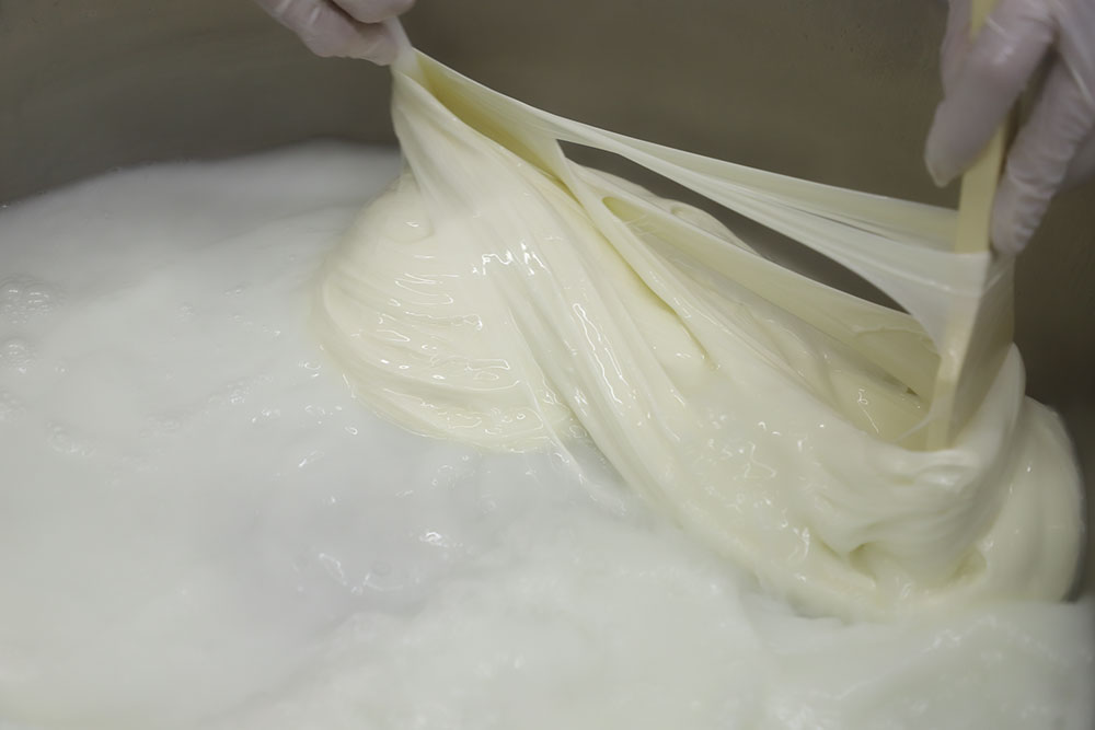 (写真右)低温殺菌後、モッツァレッラ用乳酸菌を加え、さらにレンネットを加える。