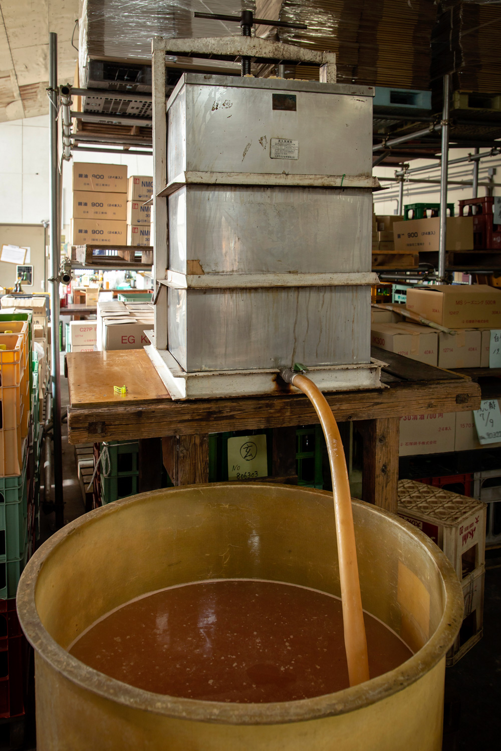 タマネギを粉砕し、槽(ふね)で搾り、加熱する。