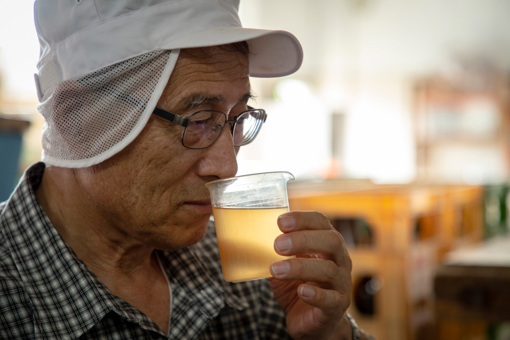 このタマネギ酒に酢酸菌を加え、2~3カ月かけて発酵、さらに3カ月熟成させ、ようやくたまねぎ酢が完成する。新しい素材や発想を取り入れつつも、初代から受け継ぐ静置発酵法で、じっくり丁寧に造る製法は変えない。「時間をかけることでしか出てこない味がありますから」。子供を育てるように、休むことなく見守る。こうして造られた酢はタマネギの香り、旨味、甘味をたたえ、マイルドでふくよか。酸味だけではない、味わいの奥深さを教えてくれる。