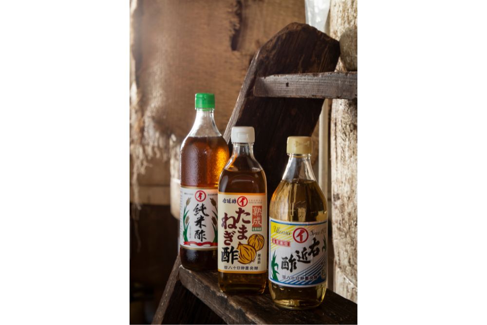 左から、佐賀県産米と生麹を使った「純米酢」702円/700ml。一般食酢の約2倍ものアミノ酸を含み、肉料理に合う「熟成たまねぎ酢」756円/500ml。酒粕を利用した「右近酢 松印」237円/500ml。
