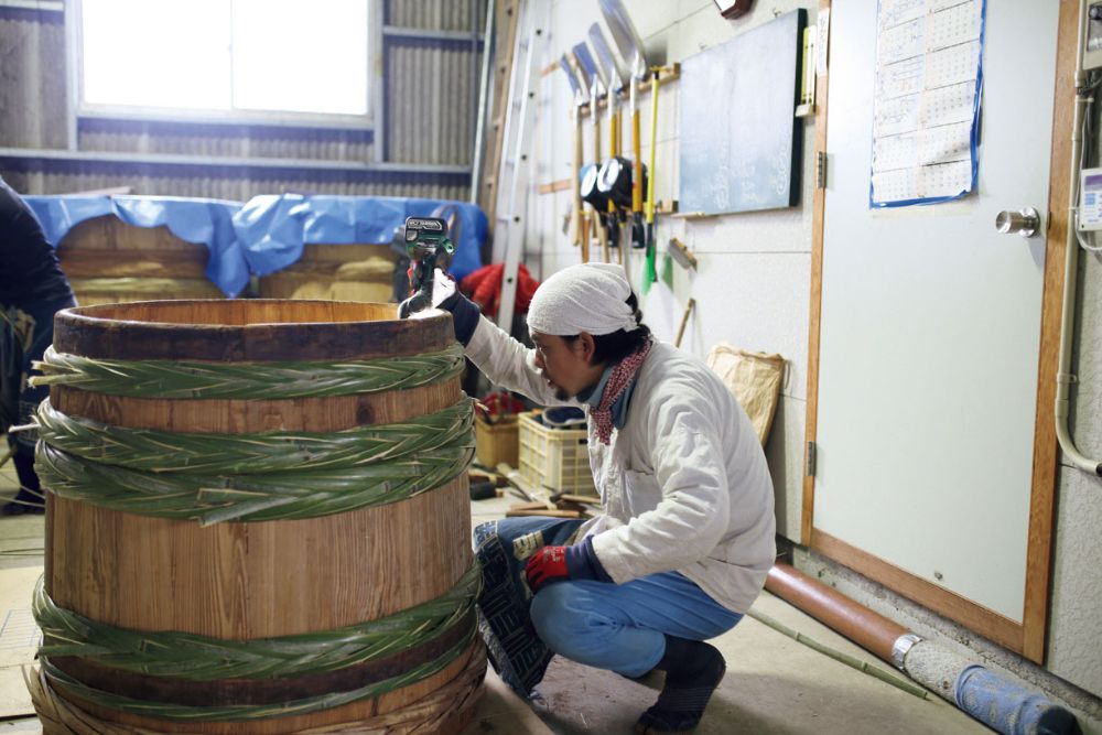 若き樽職人、湯浅啓司さん。この新樽の製作を機に、仕込み木樽を専業とし、腕を磨く。