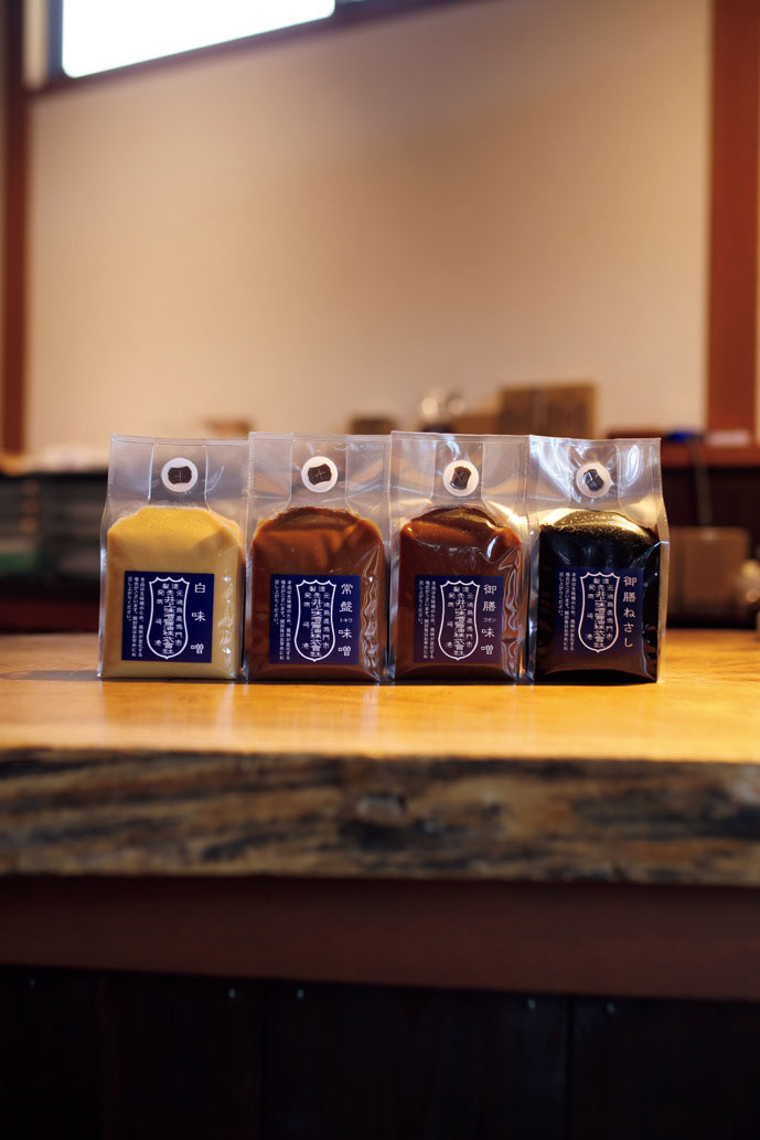 左から「白味噌」1,728円、天日塩や最上級の大豆を創業当時と同じ技術で仕込んだ「常盤味噌」1,836円、「御膳味噌」1,296円、5年以上熟成させる「御膳ねさし」は2年待ち。いずれも内容量500g。
