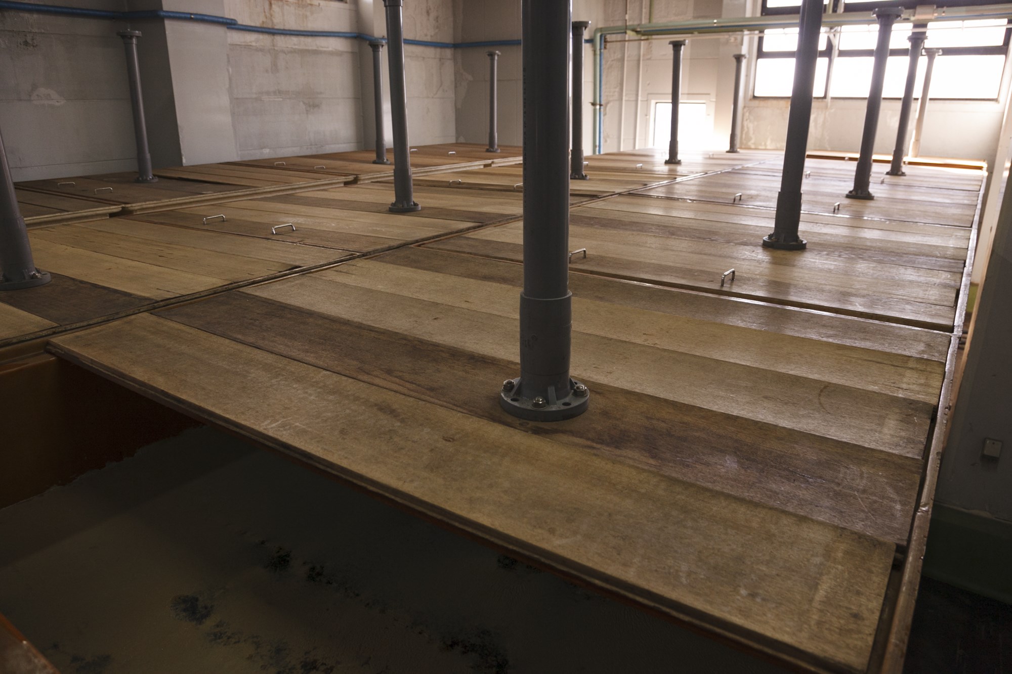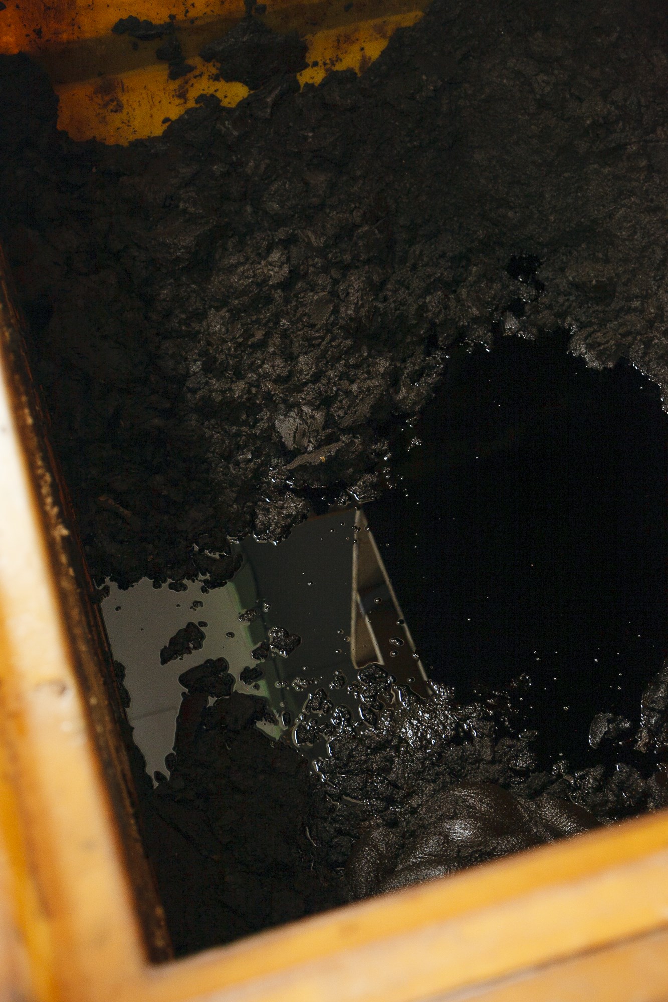 酢酸発酵の部屋。木の板を外すとうっすら湯気が立ち上り、発酵槽の内側には湯船のような温もりが感じられる。