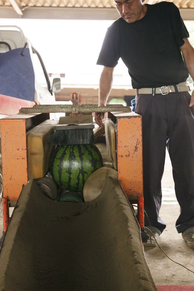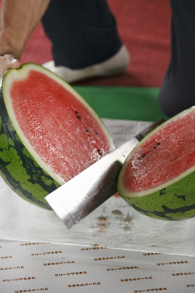 まずはスイカを食べ比べませんか。Aは最高ランク。Cは3番目です。実はこの等級、味だけで決めているわけではないんです。Cはホラ、少しだけヒビが入ってるでしょ。これが等級を下げる原因になる。カットスイカにする時に美しくないからなんですね。