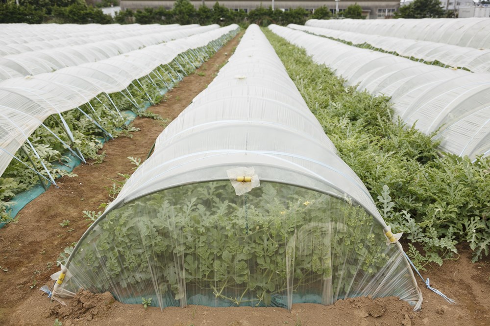 では、畑に行きましょう。スイカは1月1日には種を蒔いて、育苗ハウスで2月20日くらいまで育てて畑に植え替えます。下にはマルチシートを敷いて温めておいてから植え込み、ビニールトンネルのビニールを二重にして大きくします。苗の段階で、接ぎ木をするのが一般的で、台木にはユウガオを用います。