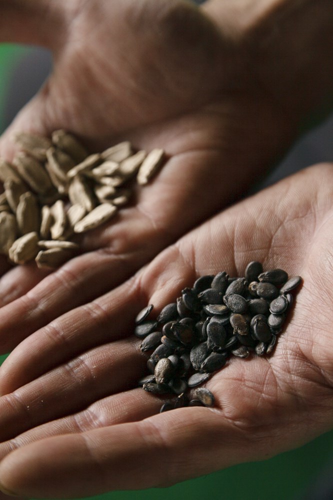 スイカの実に入っているたくさんの種を蒔いたら、誰でもスイカが作れるんじゃないか。そう思われがちですが、あの種は個性がバラバラなため、形はできても均一なクオリティにはなりにくい。種屋さんが食味が良くなるよう、様々に掛け合わせをして完成させた優良品種を、毎年購入して蒔きます。ここ15年は「祭ばやし」という品種に惚れ込んで使っています。味だけでなく食感もいいんです。