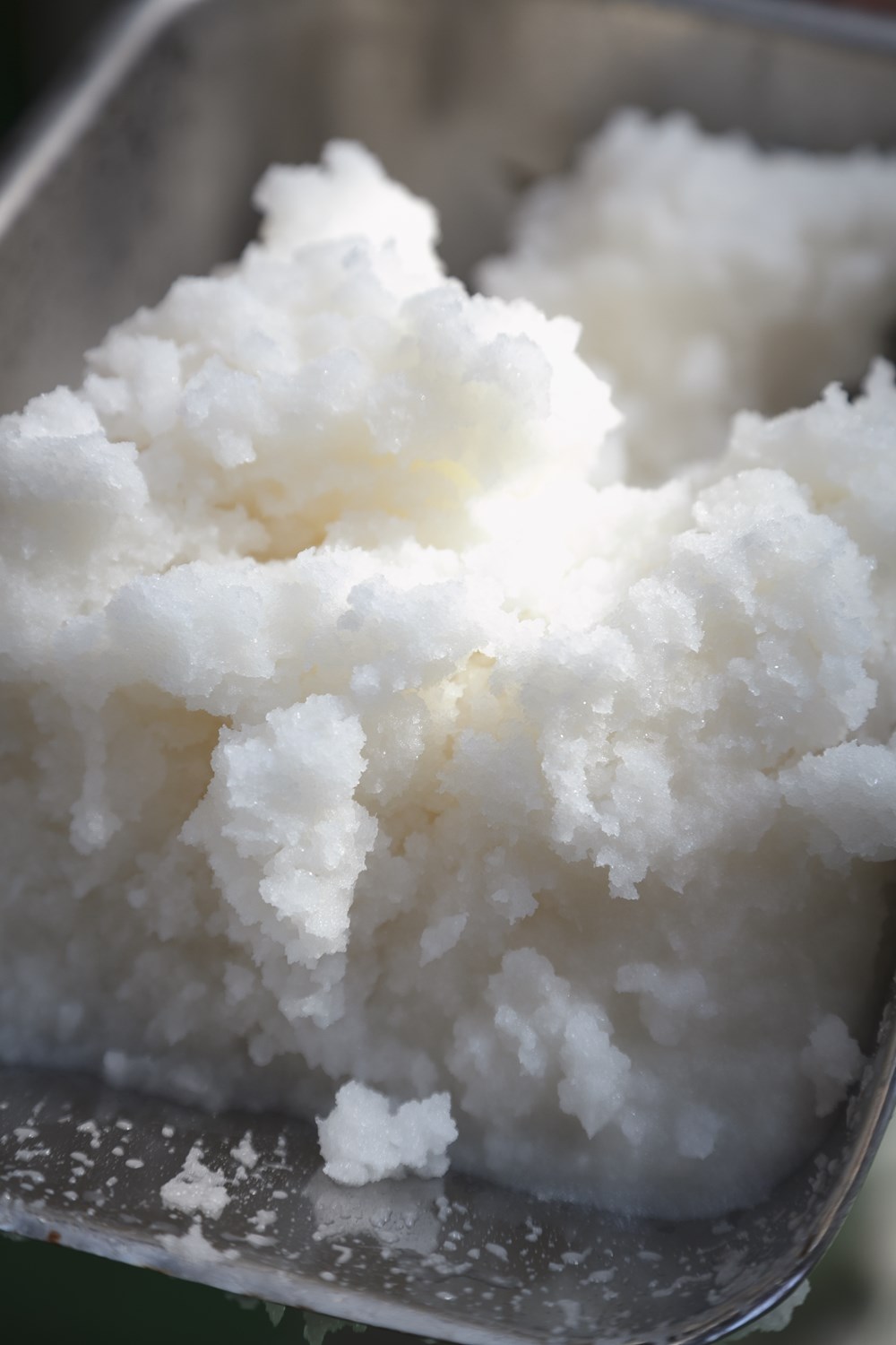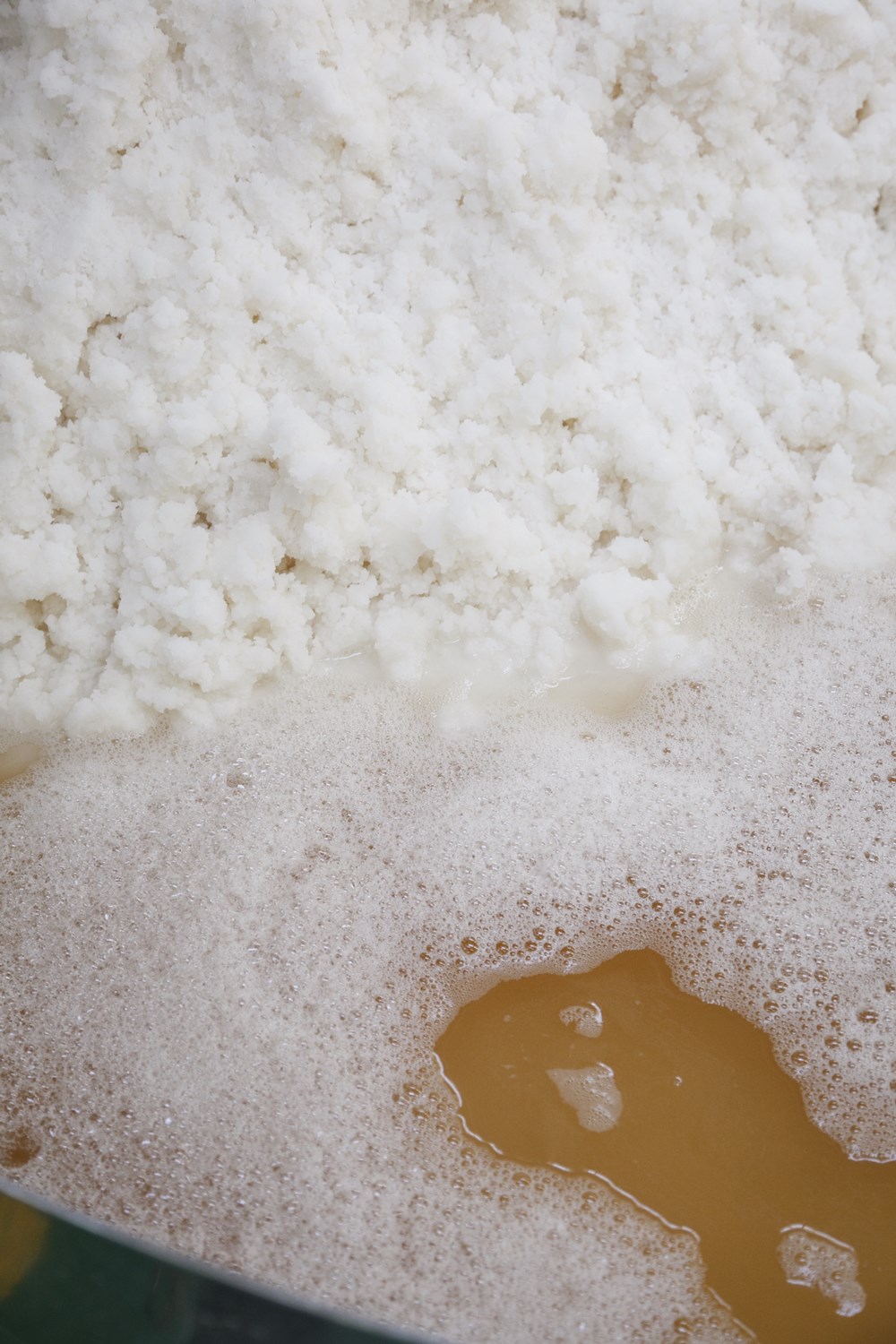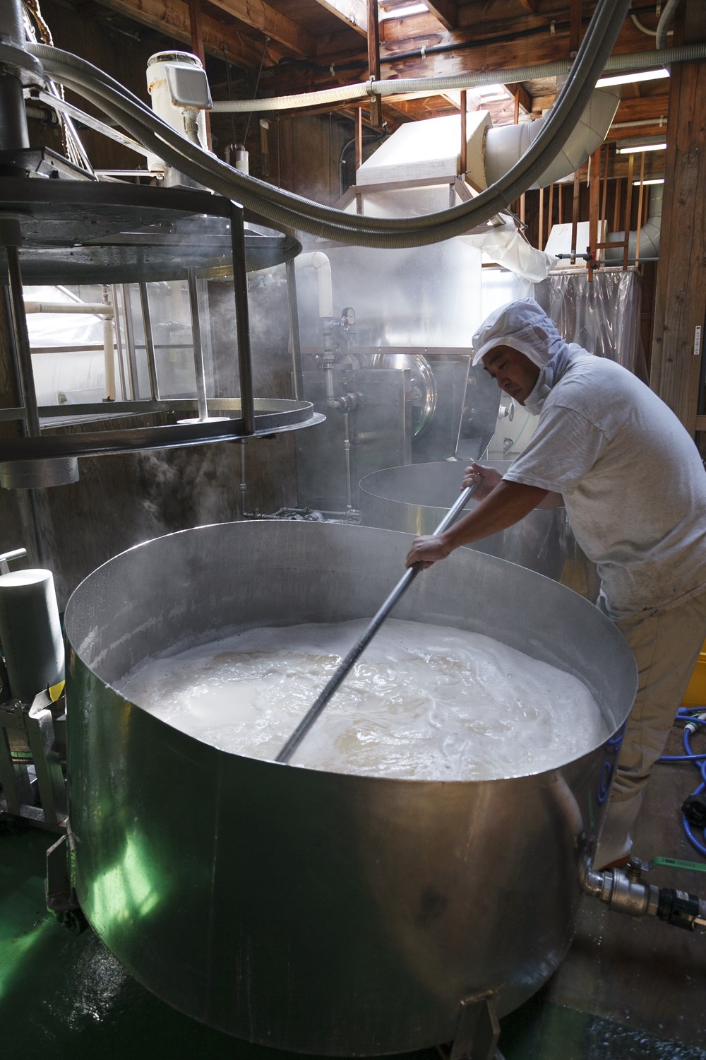 どの濃度から炊き始め、どの濃度で止めるかなどは、長年の研究の末に到達したもの。その成果がおいしい塩となって現れます。脱汁器(遠心分離器)で、主成分が塩化マグネシウムである液体の「ニガリ」を適度に残すように搾り、出来上がった塩は、吸湿するので空気に触れないよう、できるだけ速やかに袋詰めし、なるべく平らに置きます。平らに置くのはニガリが袋の下側に溜まってしまうのを避けるためです。
