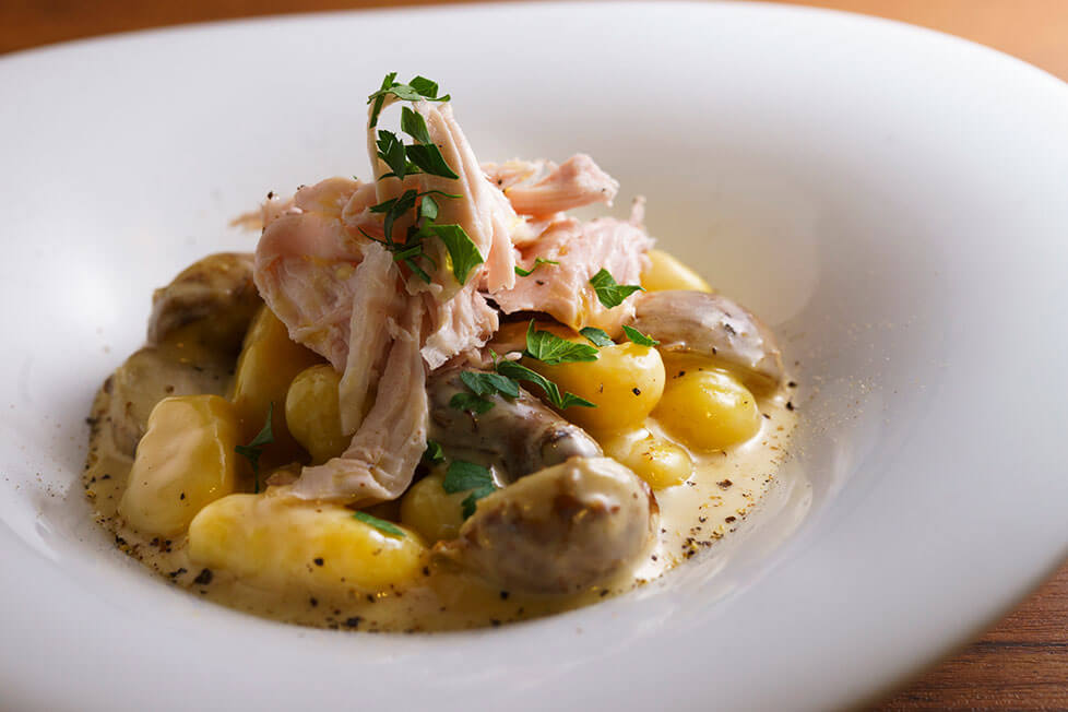 「清澄白河フジマル醸造所」の甲山雄也シェフが、茨城食材ツアーで出会った食材から着想したアイデアは5皿だ。縦横の切り方やすりおろし方など、扱いで全く異なる浮島れんこんの食感を生かした「あんこうのカダイフ巻き 浮島れんこんのすり流しとれんこんのピクルス」、香りも甘さもしっかりした仲居農園のさつまいもを練り込んでニョッキに仕立て、低温でしっとり仕上げたしゃもの胸肉、しゃもだしの旨味の濃いソースと合わせた「さつまいものニョッキと里芋、奥久慈しゃも胸肉のフリカッセ」のほか、つくばワイナリーのワインを使ったフォカッチャ、〆鯖と茨城の柿と梨のソース、奥久慈しゃものロースト しゃものだしで炊いたリゾット添え、栗のタルトと、盛り沢山な内容を、アラカルトで提供予定だ。