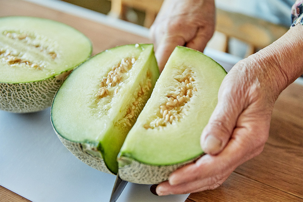 加えて、石川さんも所属するJA水戸の茨城町メロン部会「こだわりメロン研究部」では、「愛ちゃんメロン」のブランド名で、土壌診断を行ったり、有機質肥料主体の肥料設計を行うなど、メロン本来のおいしさを追求した栽培を実践。使用する農薬の量も通常の半分以下に抑えられていて、そのメロンは「いばらきエコ農産物」(特別栽培農産物)にも認証されている。栽培に手間も労力もかかるのは言うまでもないが、それに屈しないのが生産者の情熱だ。「毎日毎日見てやるのが大事。そして、ちょっとでも病気が出ればすぐに消毒してやるから、農薬も少なくて済むんです。目も気も配って大切に育てて、せっかくこれだけいいイバラキングができているので、みなさんに食べて喜んでもらいたいですね」と、石川さんは手にしたイバラキングを見つめながら、愛おしそうに目を細めた。