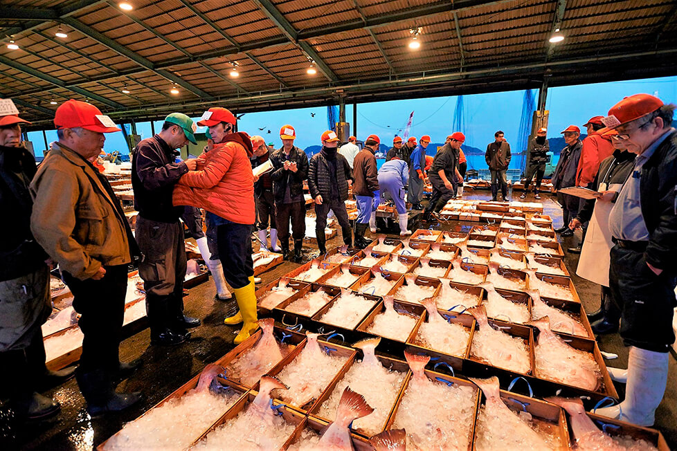 すでにノドグロ(アカムツ)、カレイ、ウチワエビ、アナゴ、アンコウ、ケンサキイカ、マアジ、ヒラメ、タイなどが並べられ、赤い帽子を被った仲買人で活気に溢れている。仲買人が上着の内側に手を隠して示した競り値を競り人が覗き込む伝統の「懐競り」で、並んだ魚が次々と競り落とされていく。