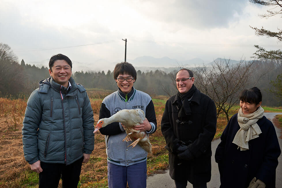 その名店で腕をふるうオージエシェフの来訪を心待ちにしていたのは、島根県のほぼ中央に位置し、江ノ川と山々に囲まれた川本町で鴨を育てる「市原ファーム」の市原弘明さんと息子の利成さんである。