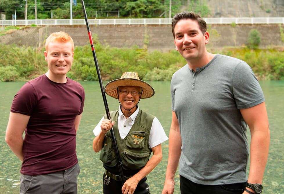 古座川漁業協同組合の代表理事 組合長でもある橋本尚視さんは、この道40年の鮎釣り師。ミッチとマークに鮎の生態や釣りのコツを教えてくれた。鮎は生きた鮎で釣る。だから、仕掛けの鮎がいかに自然な動きに見えるかを、竿でコントロールする。そこが難しい。また、水中の岩に生える苔を食べる鮎は、川の中に点在する岩にそれぞれが縄張り意識を働かせているから、それらを刺激するといいという。