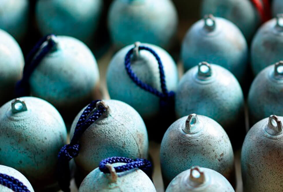 Various kinds of things are made through metal-casting but the objects that best represent Kashiwagi’s foundry are musical instruments, specifically bells, such as cat bells, furin wind bells and orin which are used for religious rites of Buddhism, made of copper-tin alloy named “sahari”.
