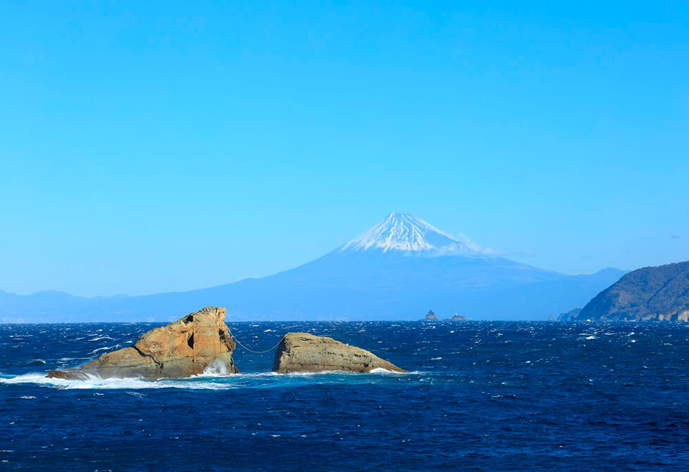 We invite you to take a trip to the south and west coast of the peninsula, which is full of ruggedly rocky areas, formed mainly in the epoch of submarine volcanoes. A trip to this area by train, however, is not easy. Take the Tokaido Shinkansen (Kodama) to Atami and then change to JR Ito Line, which goes along the east coast to Shimoda (connected to Izu Kyuko Express Line on the way at Ito Station). Further, there is no railway to continue the trip around the peninsula. Without a car it is almost impossible. But the taste of honey becomes sweeter if you obtain it with difficulty. Romantic Japan tends to lie beyond the reach of the railroad network. Your hard work will definitely pay off. Here, you may be able to see magnificent Mt. Fuji and an unforgettable sunset over the ocean.