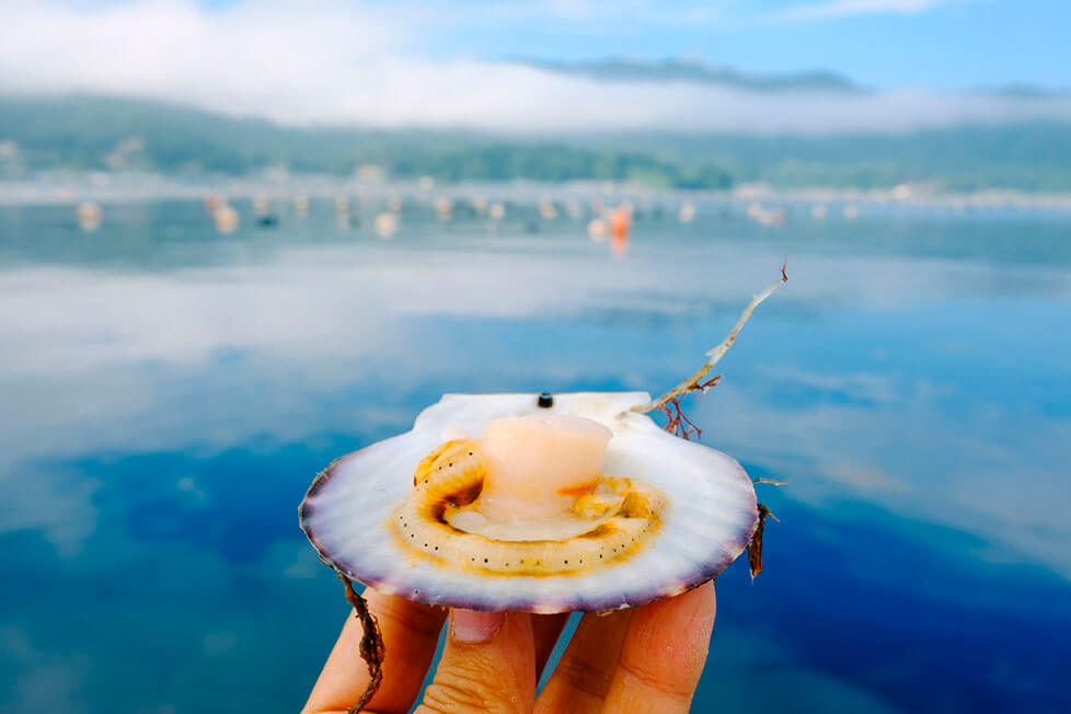 As the boat pulls up beside a wooden raft, Nakamura plunges his hands into the sea and reels in a line of scallops. The bivalves dangle from the rope like bracelet charms. In a flash, he pries open the shells and cuts the meat from the bright orange roe. The flavor is exquisite – a blast of sweetness, brine, and umami in equal measure.