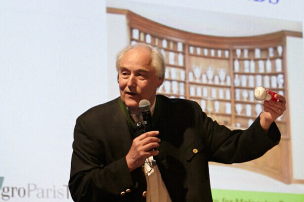 「未来のキッチン」と称する画像を前にレクチャーするエルヴェ・ティス博士。 ル・コルドン・ブルーパリ校創立120周年を記念して、ル・コルドン・ブルー×国立民族学博物館×立命館大学の共催によるシンポジウム...