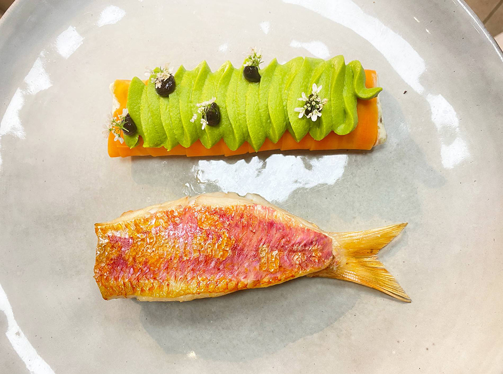 (写真2枚目)「ヒメジのプランチャ 白身魚と海藻のタルタルを詰めたニンジンのカネロニ、グリーンピースのクリームと黒レモンのせ」。サービス時に自家製コチュジャンを魚のだしでのばしたソースを添える。