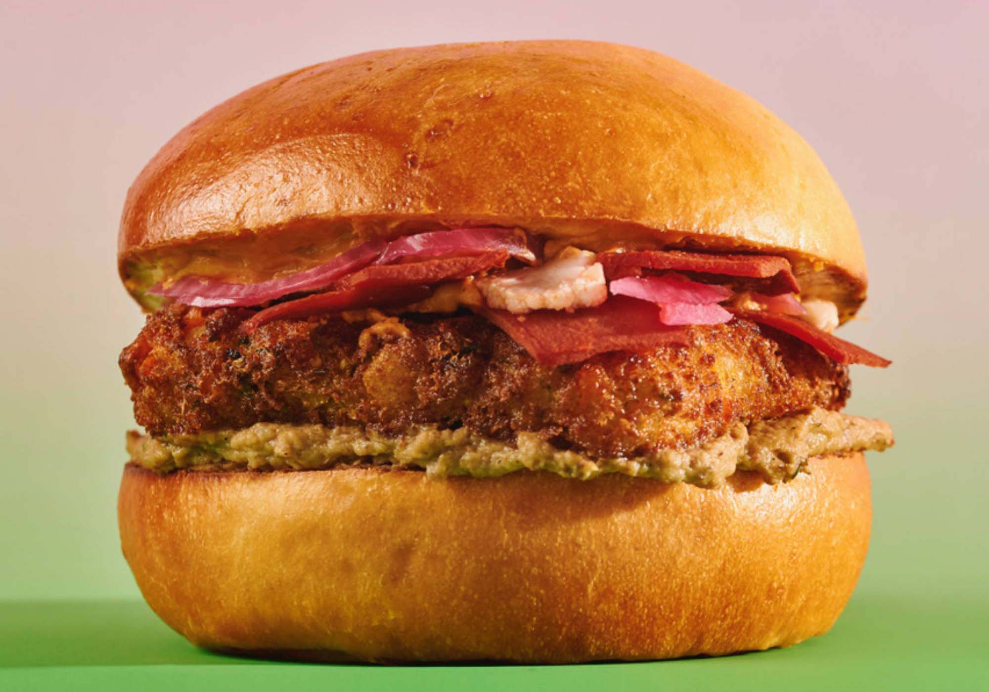 バーガーといっても、そこは巨匠。“味、健康、地球によい”をテーマに、100%植物性を実現した。ふんわりバンズはヴィーガン。パテは、ズッキーニ、ニンジン、レンズ豆、キヌアなどの野菜ガレット。とろとろに焼いたナスとピクルス、スパイシー・ヴィーガンマヨネーズなどのソースが味付けだ。