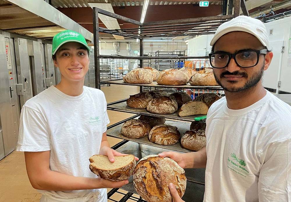 (写真トップ)「アンチ・インフレ・パン」を手にしたパン職人マイスター学校の生徒、カロリーネさん(左)とブピンダーさん。
