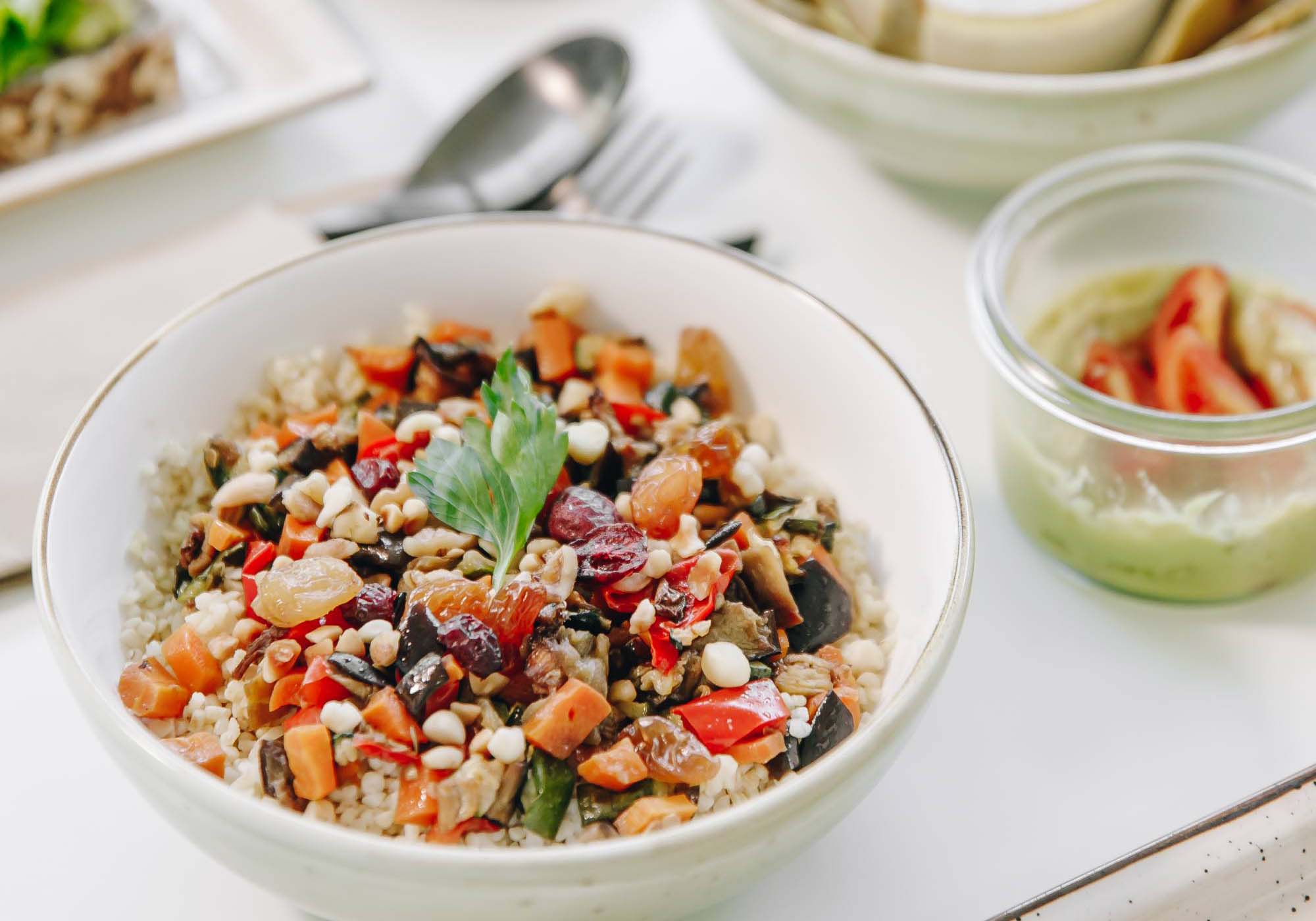 (写真)人気の週末ブランチ(11:00~15:30)の一例。ブルグル(挽き割り小麦)とカポナータ、アンズ、アーモンド、ヘーゼルナッツ、レーズンのアグロドルチェ風味や、ラップサンド用のパンを添えたフムス、ジュースやエスプレッソなどのドリンク類、ドルチェが付く(20~25ユーロ)。