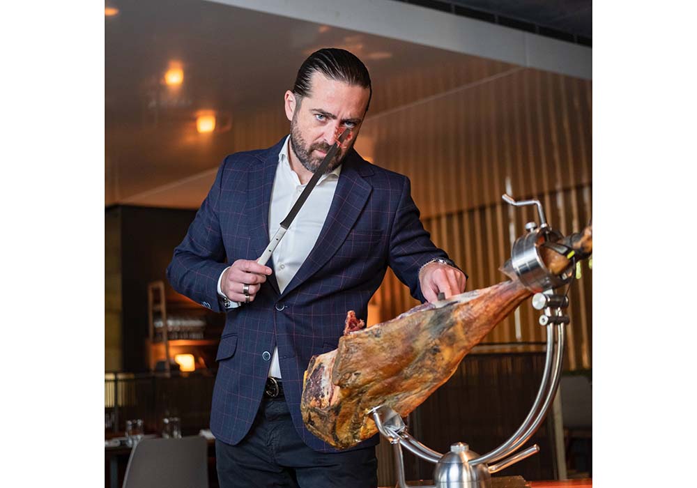 (トップ写真)主にVIPや有名ブランドなどのイベントで活躍するエミリオ。彼のハモンに対する知識とこだわりと美学が、コルタドールという職業の認識を高めている。
