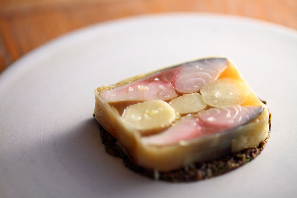 「刺し身としゃぶしゃぶの間くらい」という絶妙の火入れ加減が「ぼうぜ鯖」の身の締まりを良くし、滑らかで艶やかな身質にしています。ジュレとの相性も抜群。断面を生かしたビジュアルが、「ぼうぜ鯖」のたっぷりとした身の厚みを美しく印象的に見せて、視覚的にも味覚的にも効果絶大です。