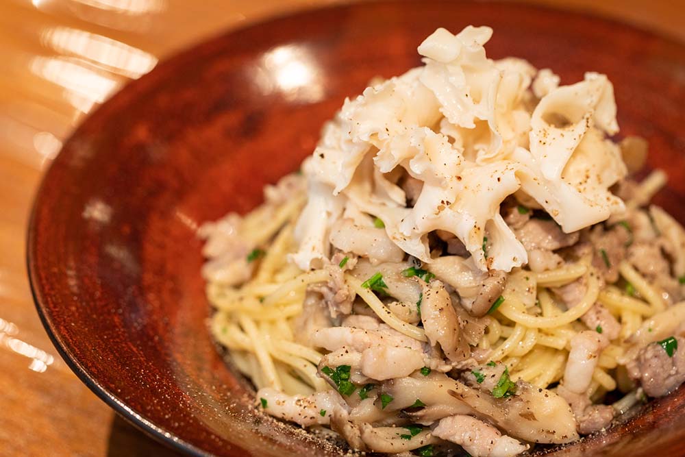 パスタがスープを吸って、ツヤツヤになってくれば完成の合図。パセリと黒コショウを振って茹でた花びら茸を盛り付けます。