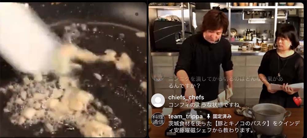 1時間があっという間に感じたインスタライブ。コメント欄では「塩の種類は?」「ニンニクの産地はどこ?」など調味料や食材に関するもののほか、「塩、あんなに入れて辛くならない?」など率直な感想もたくさん。シェフの的確な指導に俄然やる気が出てきたのか、メラメラと炎のマークが連続投稿されるシーンもありました。