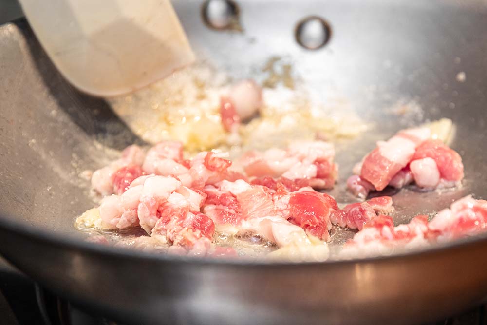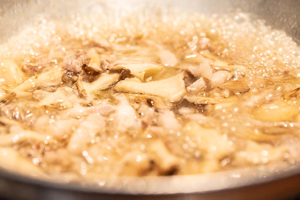 豚肉を投入後もこのネバネバ泡は続きます。さらに泡が少なくなって、パチパチ乾いた音になってくれば豚肉の味が出てきたということ。このタイミングで舞茸を加えて炒め合わせます。最後に泡も出なくなってくれば、「すべての食材の旨味が凝縮したよ、というサインです」とシェフ。