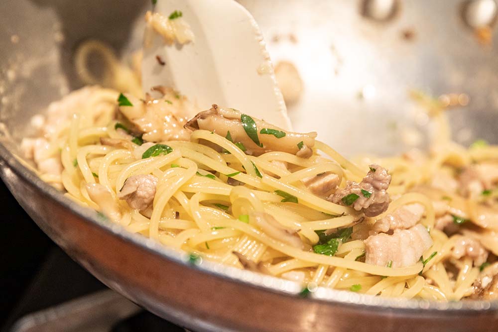 旨味たっぷりのスープができたら、最後の仕上げです。スープに指定時間より短めに茹でたパスタを加えます。パスタにスープをしっかり吸わせて・・・と、ここでシェフから最後のポイント。「あおったりしないこと。触りすぎると、パスタがスープを吸う時間がかかって伸びてしまいます」。さらにこのタイミングでフライパンをあおると、パスタの表面がぶつかりあって、べちゃつく原因にもなるそう。