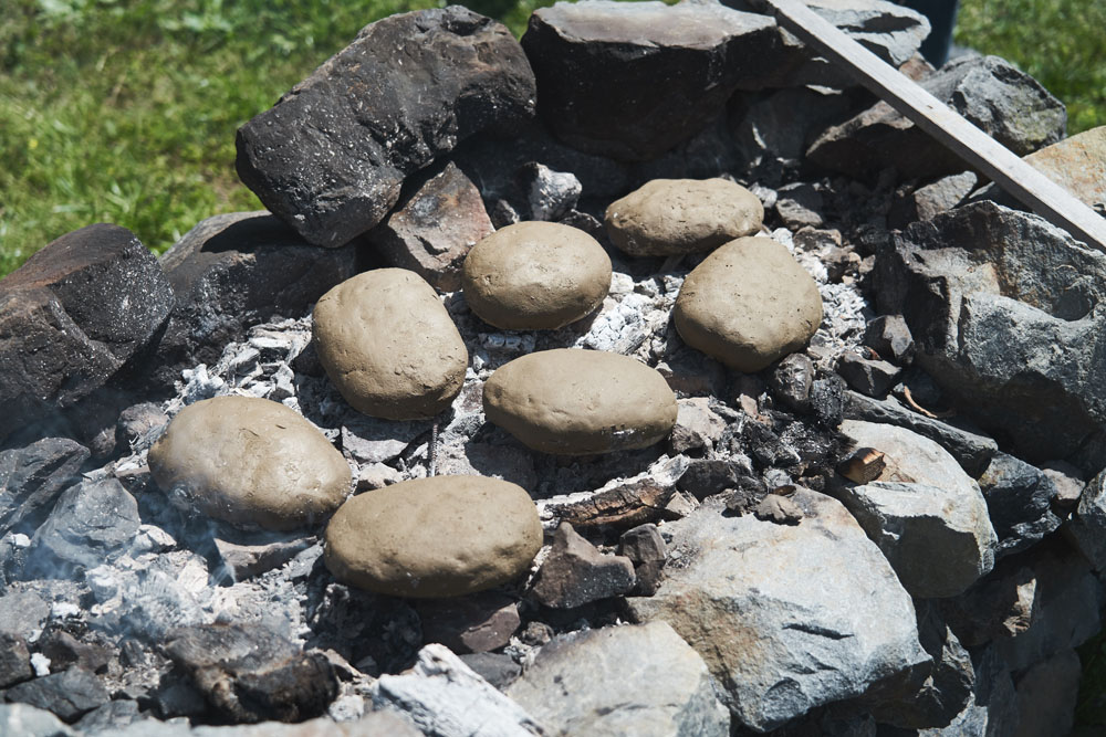 すき間なく包んだら、間伐材から熾した薪火に投入して40~50分加熱、という原始的な調理法。土づくりワークショップと連動したメニューで、畑の土をこんなふうに活用できることに参加者はびっくり。
