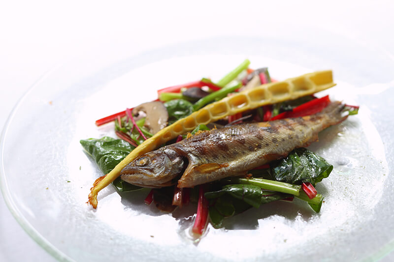 (山女魚、スイスチャード、ほうれん草、乾し椎茸、コサン筍)