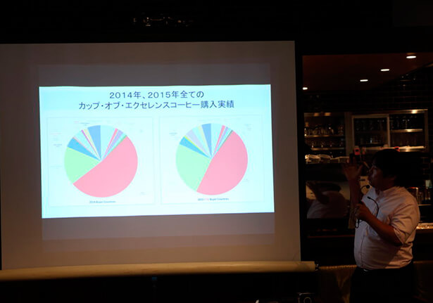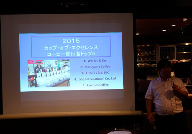 スクリーンに映し出されるコーヒー買い付け者トップ5。上位3位が日本の買い付け者だ。